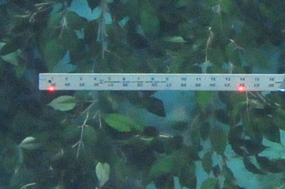 Tests using rulers show that while refraction does occur, it involves all components, so laser spots set 12″ apart outside the aquarium, will show up 12″ apart on the ruler, but both the ruler and the spots will seem to be about 30% larger than they really are – this has been the bane of all outside-the-aquarium fish measurements to date. The black tip shark in the attached image had been estimated to be 50″ long. The lasers show that it is actually only 39″ long.