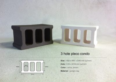 These interesting, functional pieces have perhaps more to offer than simply being pleco condos; the applications for species that require a lot of cover range far beyond. Currently, Pleco Condos come in 3 configurations: a small 3-hole variant, along with both a small and large 5-hole design. The condos come in two colors, white and brown, although in the photos, brown looks more like gray.
