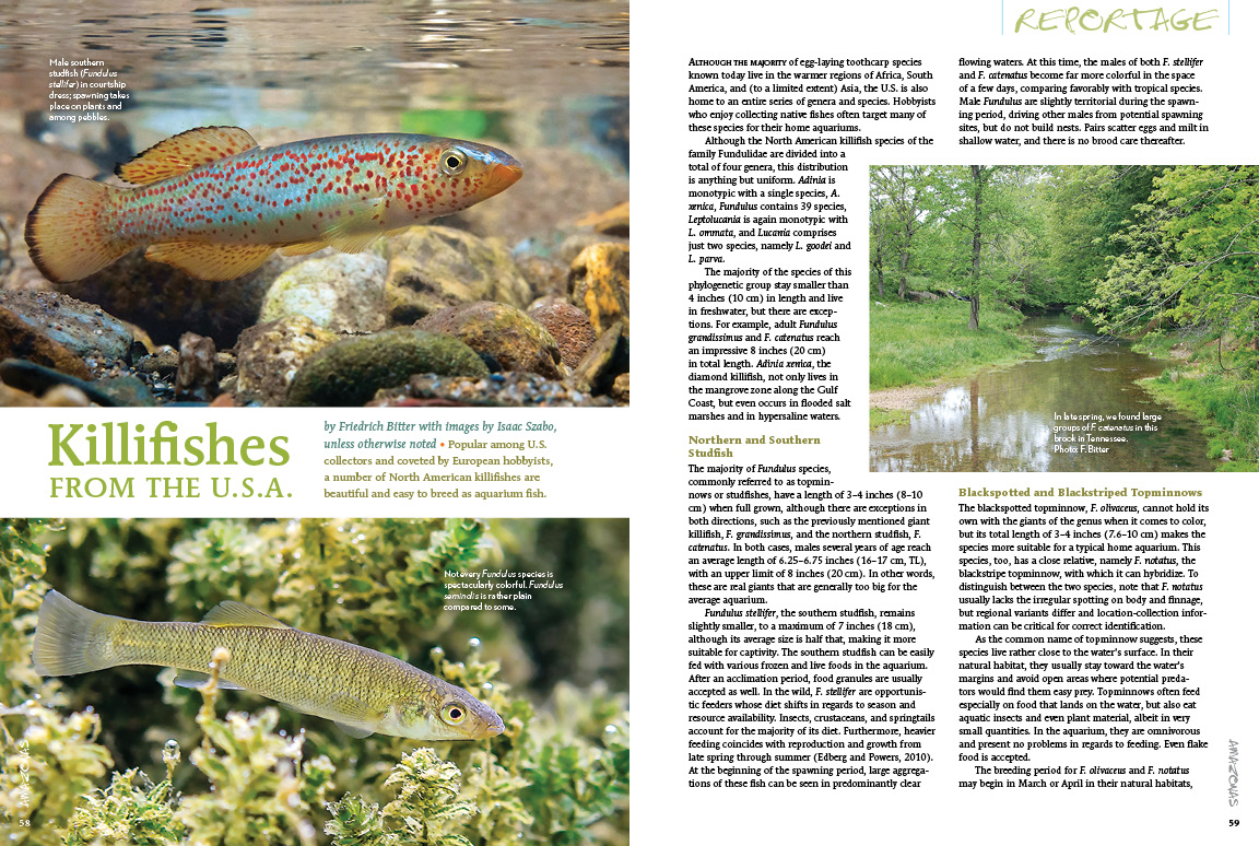 A number of North American killifishes are beautiful and easy to breed as aquarium fish. Friedrich Bitter introduces you to many ideal species, with images by Isacc Szabo and others.