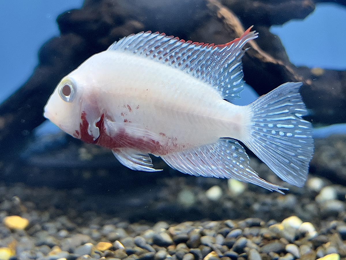 It’s not often a new non-hybrid, line-bred strain of Central American cichlid appears. Especially in a species that has been in the hobby for over a century! So I had to do a double take on a recent trip to Aquarium Design Group when I saw what is likely one of the first offerings in the United States and the newest strain of cichlid available to aquarists: a pair of albino firemouth cichlids.