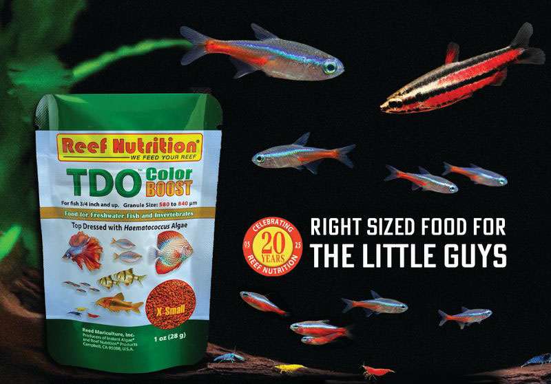 Reef Nutrition (a Reed Mariculture, Inc. company) is a leader in premium-quality aquatic foods. The company proudly introduces TDO Color BOOST™, a scientifically formulated food engineered for vibrant pigmentation, accelerated growth, and superior nutrition for freshwater species. TDO Color BOOST ™ is appropriately sized and has an exceptional nutrient profile ideal for maintaining fish health, color, and promoting good growth – delivering clean nutrition in every bite.